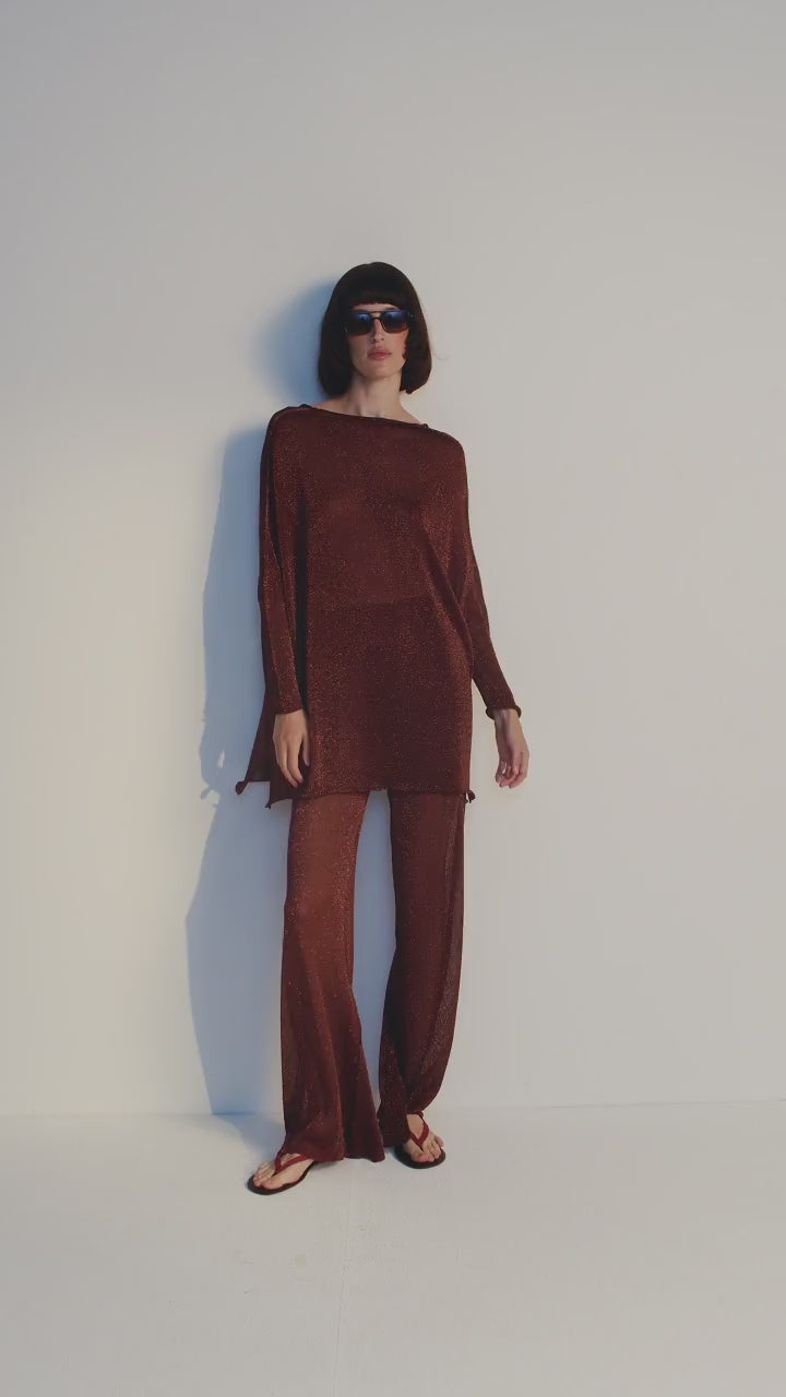 Dieses moderne 2-teilige Set ist aus leichtem, transparentem Strick mit Metallic-Faden gefertigt und bietet dezente Leuchtkraft und Leichtigkeit. Das lässige Oberteil fällt fließend über den Körper und hat einen V-Ausschnitt und einen verlängerten Saum. Die weite Hose verfügt über einen bequemen Gummibund für müheloses Anziehen. Kombinieren Sie die beiden Teile für elegante Abendveranstaltungen oder tragen Sie sie einzeln für dezente Eleganz.